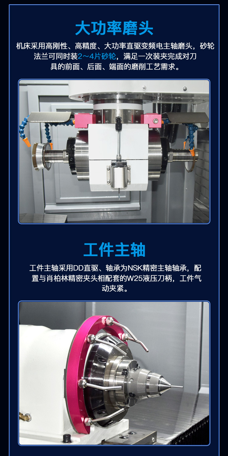 2.機(jī)床采用高剛性、高精度、大功率(18KW)直驅(qū)變頻電主軸磨頭,砂輪法蘭可同時(shí)裝2~4片砂輪,滿足一次裝夾完成對(duì)刀具的前面、后面、端面的磨削工藝需求。