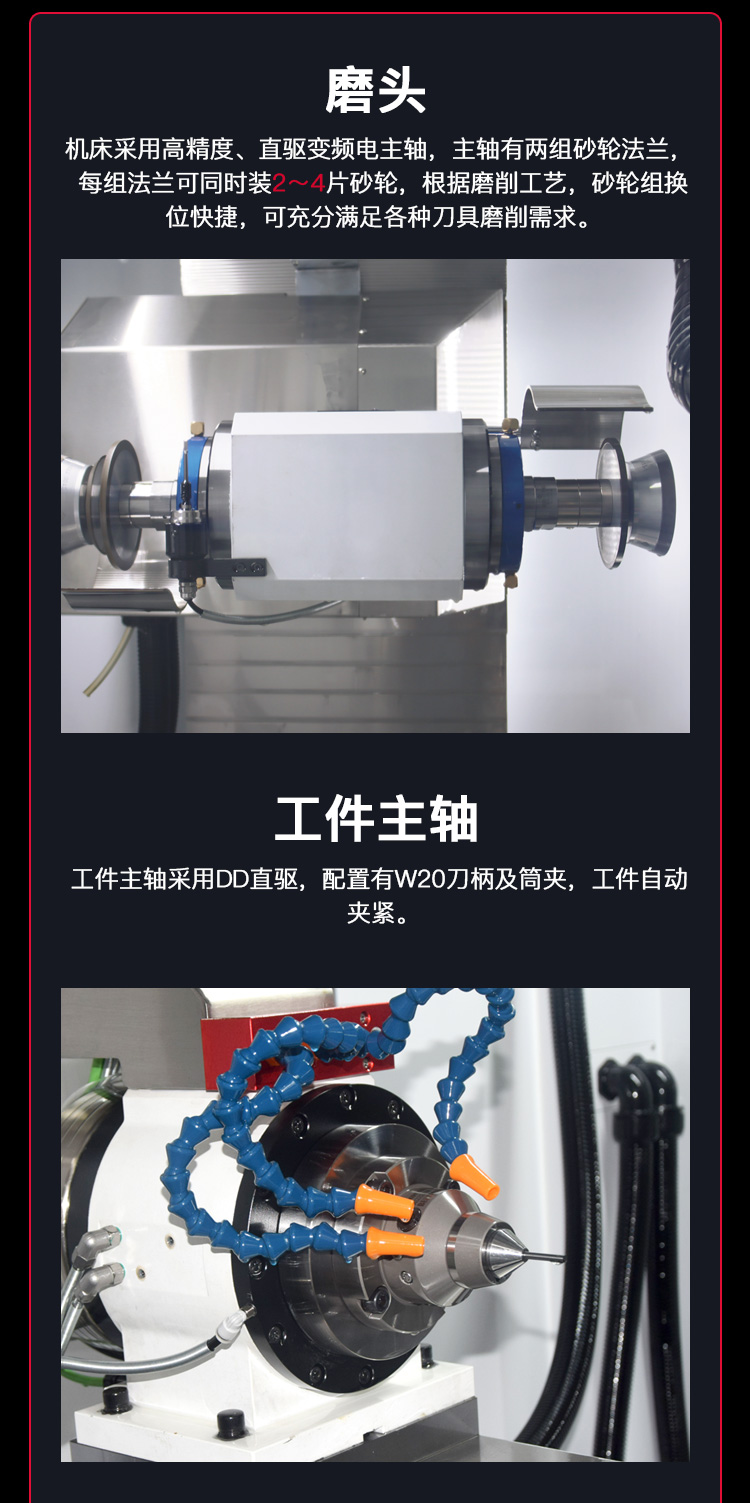 2. 機床采用高精度、直驅變頻電主軸,主軸有兩組砂輪法蘭,每組法蘭可同時裝2~4片砂輪,根據磨削工藝,砂輪組換位快捷,可充分滿足各種刀具磨削需求。