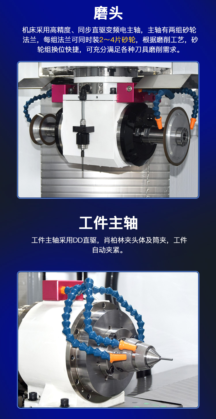 機床采用高精度、同步直驅變頻電主軸,主軸有兩組砂輪法蘭,每組法蘭可同時裝2~4片砂輪,根據磨削工藝,砂輪組換位快捷,可充分滿足各種刀具磨削需求。